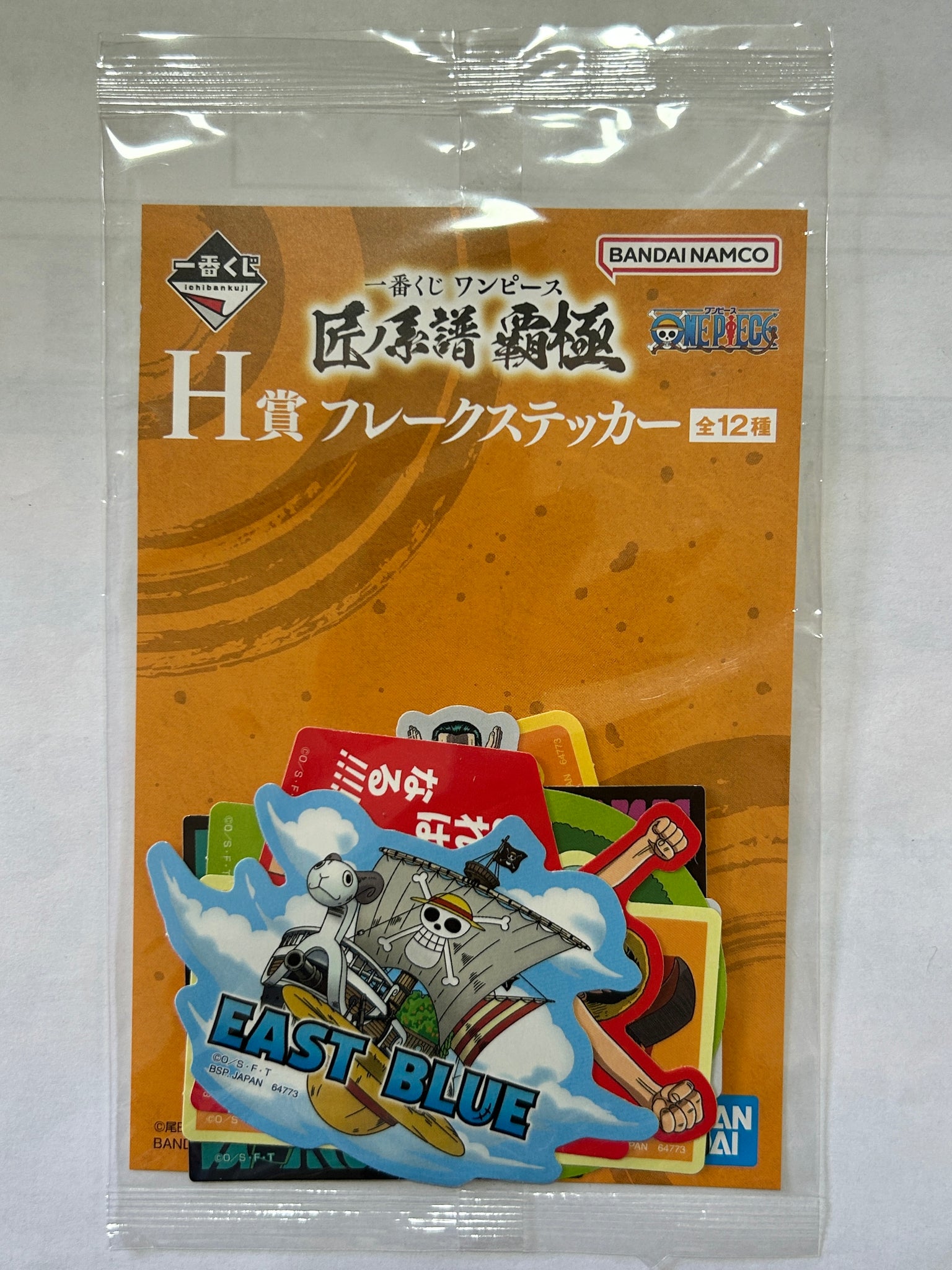 Product Description: This is a prize from the "Ichiban Kuji One Piece Takumi no Keifu Hagyoku" lottery. This set includes eight die-cut stickers, one for each episode.