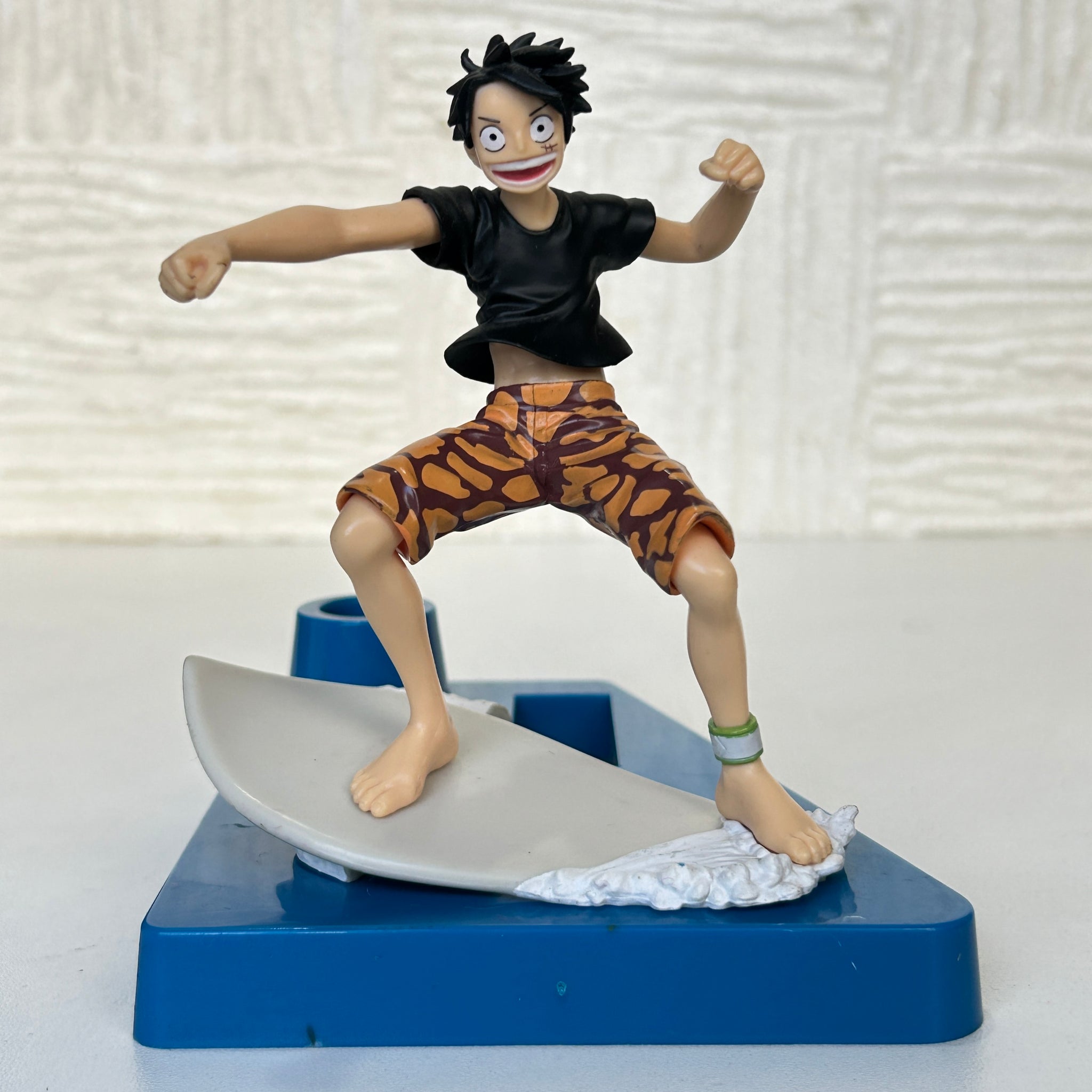 This campaign-exclusive original holder stand comes with a figure of Luffy, the main character from the popular "One Piece" series, surfing.